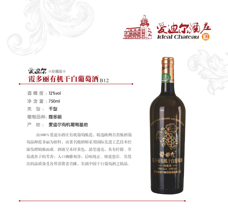 饮食搭配建议:干白葡萄酒在8-12℃时饮用效果最佳,辅之以海鲜,清淡佳肴,是您回归自然,享受高雅生活的极佳选择。 爱迪尔霞多丽有机干白葡萄酒由100%爱迪尔酒庄有机葡萄酿造,精选欧洲名贵酿酒葡萄品种霞多丽为原料,由著名酿酒师采用国际先进工艺技术控温发酵精酿而成。酒液呈禾杆黄色,晶莹透亮,具有柠檬、草莓或杏子的芳香;入口幽雅爽净,后味纯正、绵延悠长。其优良的品质备受各界消费者青睐,实属中国干白葡萄酒之精品。