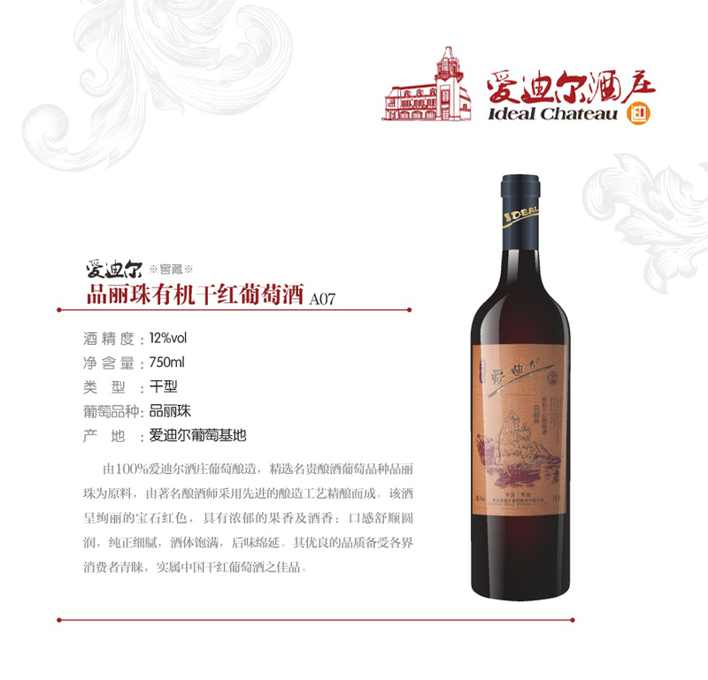 饮食搭配建议:干红葡萄酒在16-18℃时饮用效果最佳, 与奶酪,红肉是完美的搭配,是您享受生活的绝佳之选。 爱迪尔品丽珠干红葡萄酒由100%爱迪尔酒庄有机葡萄酿造,精选名贵酿酒葡萄品种品丽珠为原料,由著名酿酒师采用先进的酿造工艺精酿而成。该酒呈绚丽的宝石红色,具有浓郁的果香及酒香;口感舒顺圆润,纯正细腻,酒体饱满,后味绵延。其优良的品质备受各界消费者青睐,实属中国干红葡萄酒之佳品。