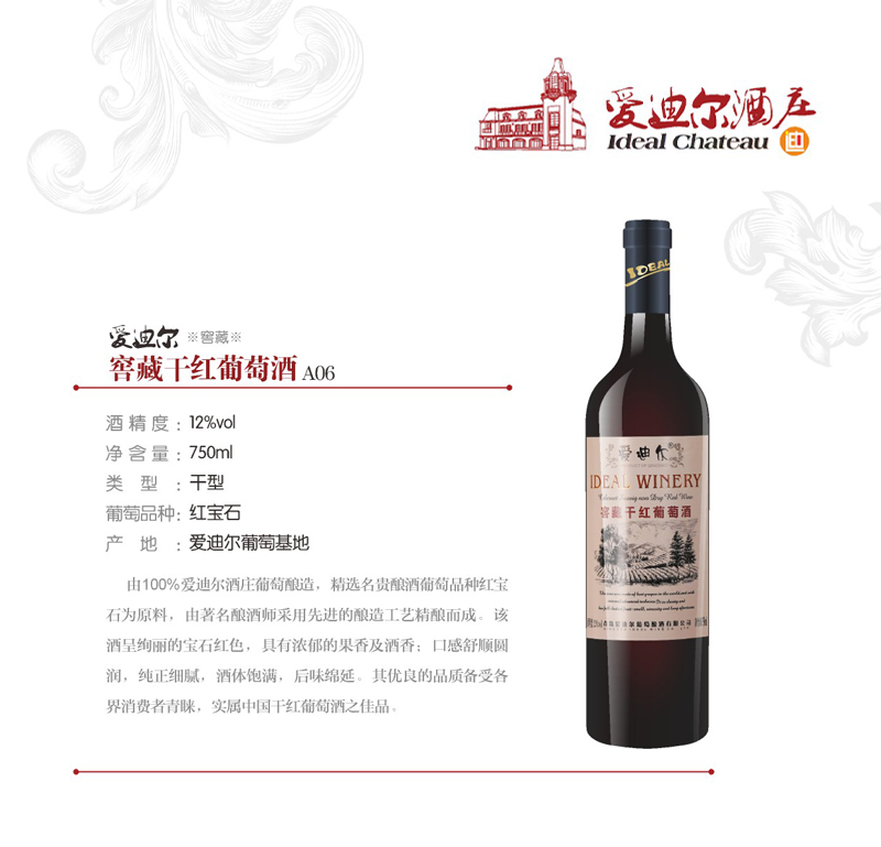 爱迪尔窖藏干红葡萄酒由100%爱迪尔酒庄有机葡萄酿造,精选名贵酿酒葡萄品种梅乐为原料,由著名酿酒师采用先进的酿造工艺精酿而成。观之呈亮丽的宝石红色,果香幽雅浓郁,酒香纯正;入口圆润舒顺,单宁酸味柔和协调,口感别致,回味悠长。其优良的品质备受各界消费者青睐,实属中国干红葡萄酒之上品。