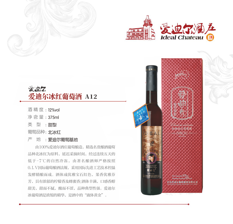 A31经典冰红葡萄酒由100%爱迪尔酒庄有机葡萄酿造,精选名贵酿酒葡萄品种赤霞珠为原料,延迟采摘时间,经过连续五天的低于-7℃的自然冷冻,使果实里的糖分和水分离,在凌晨以手工将挂在葡萄藤上的冰葡萄迅速采摘,由著名酿酒师严格按照0.I.V国际葡萄酿酒法规,采用国际先进工艺技术控温发酵精酿而成。酒液呈经典的禾杆黄色,晶莹剔透,果香优雅芬芳,具有浓郁的柠檬香及蜂蜜香;酒体丰满,口感香醇甜美,甜而不腻,酸而不涩,品种典型性强。爱迪尔冰葡萄酒是浓缩的精华,是酒中的“液体黄金”。