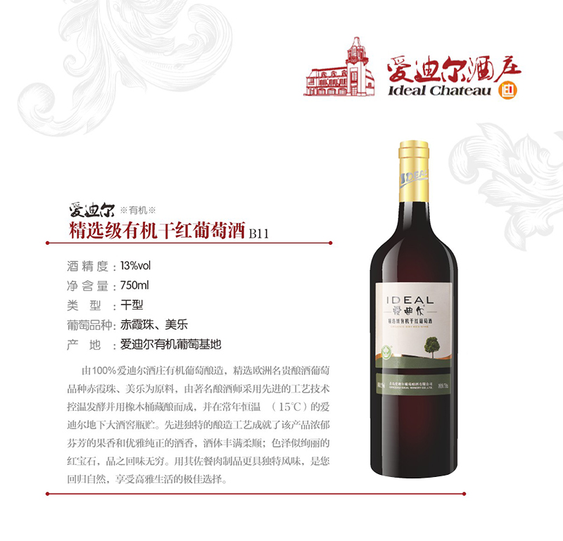 爱迪尔精选级有机干红葡萄酒,由100%爱迪尔酒庄有机葡萄酿造,精选欧洲名贵酿酒葡萄品种梅乐为原料,由著名酿酒师采用先进的工艺控温发酵,并用橡木桶藏酿而成。先进独特的酿造工艺成就了该产品浓郁芬芳的果香和优雅纯正的酒香,酒体丰满柔顺,色泽似绚丽的红宝石,品之回味无穷。