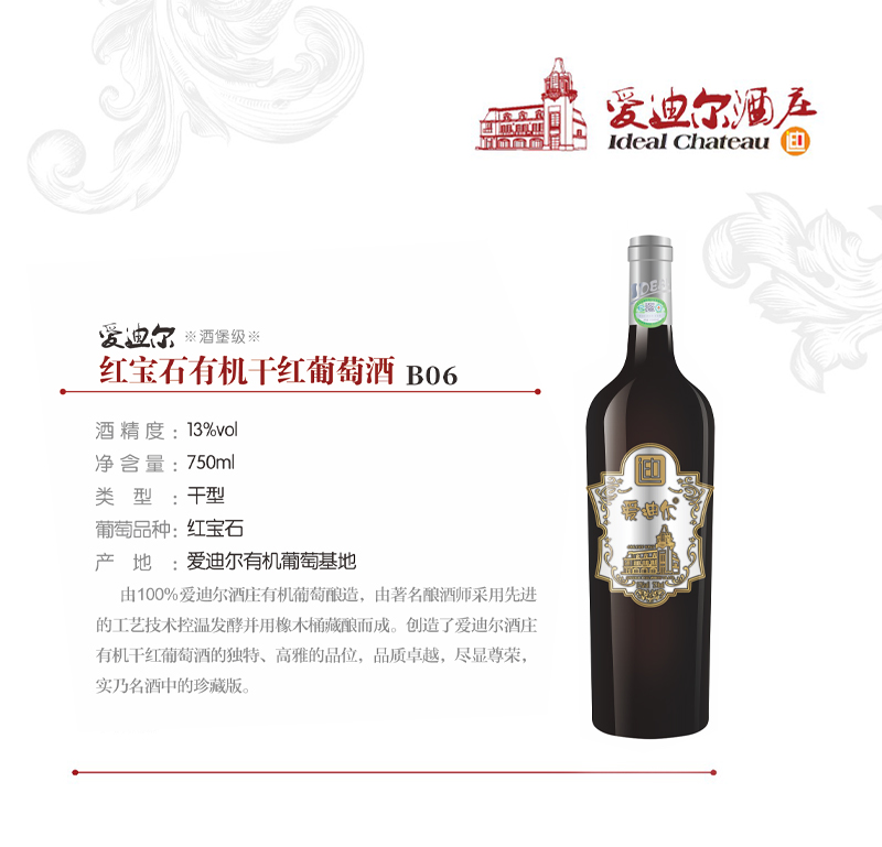 爱迪尔红宝石有机干红葡萄酒由100%爱迪尔酒庄有机葡萄酿造,由著名酿酒师采用先进的工艺技术控温发酵并用橡木桶藏酿而成。创造了爱迪尔酒庄有机干红葡萄酒的独特、高雅的品位,品质卓越,尽显尊荣,实乃名酒中的珍藏版。