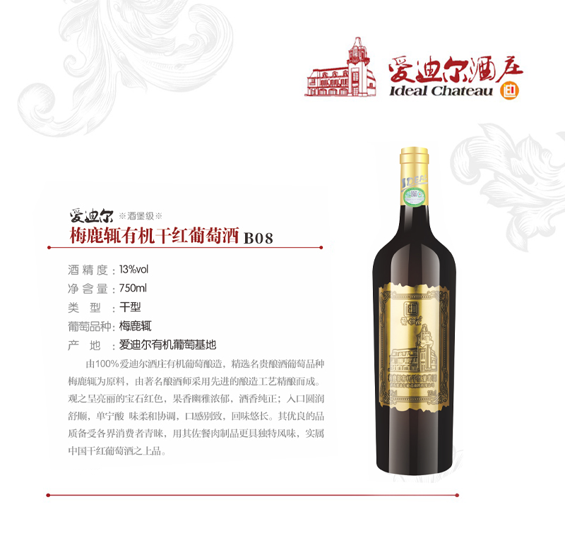 爱迪尔梅鹿辄干红葡萄酒由100%爱迪尔酒庄有机葡萄酿造,精选名贵酿酒葡萄品种梅鹿辄为原料,由著名酿酒师采用先进的酿造工艺精酿而成。观之呈亮丽的宝石红色,果香幽雅浓郁,酒香纯正;入口圆润舒顺,单宁酸 味柔和协调,口感别致,回味悠长。其优良的品质备受各界消费者青睐,用其佐餐肉制品更具独特风味,实属中国干红葡萄酒之上品。