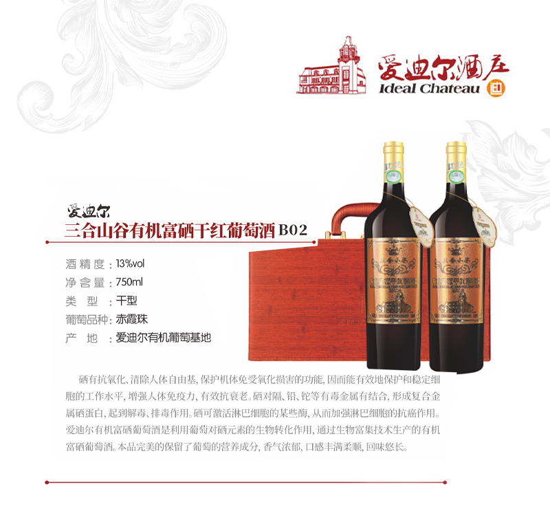硒,人类健康的守护神! 硒有抗氧化、清除人体自由基,保护机体免受氧化损害的功能,因而能有效地保护和稳定细胞的工作水平,增强人体免疫力,有效抗衰老。硒对隔、铅、铊等有毒金属有结合,形成复合金属硒蛋白,起到解毒、排毒作用。硒可激活淋巴细胞的某些酶,从而加强淋巴细胞的抗癌作用。 爱迪尔有机富硒葡萄酒是利用葡萄对硒元素的生物转化作用,通过生物富集技术生产的有机富硒葡萄酒。本品完美的保留了葡萄的营养成分,香气浓郁,口感丰满柔顺,回味悠长。